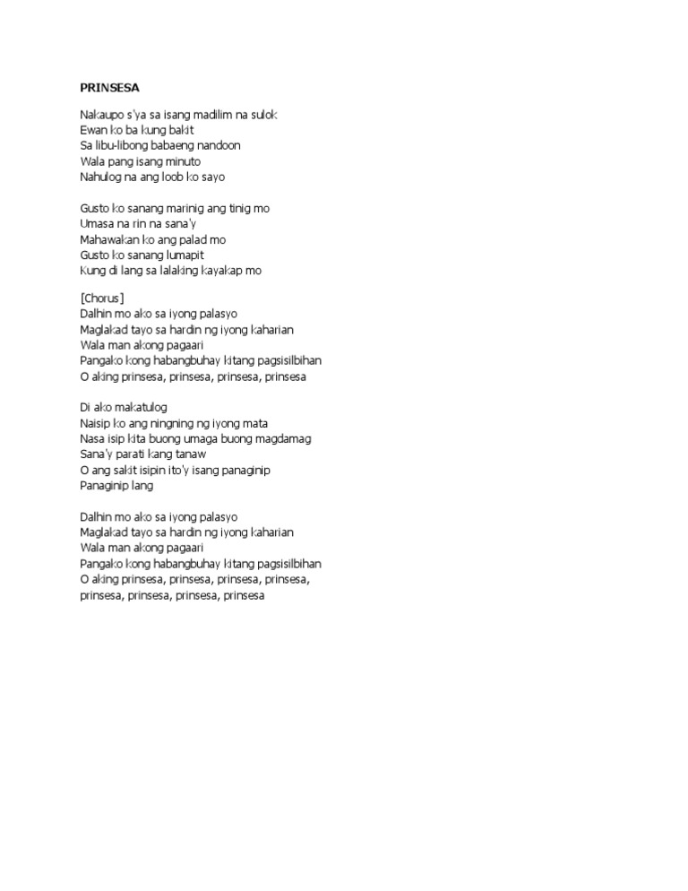 Gusto ko sanang lumapit kung di lang sa. O aking prinsesa ah. Gusto ko sanang marinig ang tinig mo umasa na rin na sanay mahawakan ko ang palad mo gusto ko sanang lumapit kung di lang sa lalaking kayakap mo dalhin mo ako sa iyong palasyo maglakad tayo sa hardin ng iyong kaharian wala man akong pag-aari pangako kong habang-buhay kitang pagsisilbihan o aking prinsesa prinsesa prinsesa prinsesa di ako. Mahawakan ko ang palad mo.